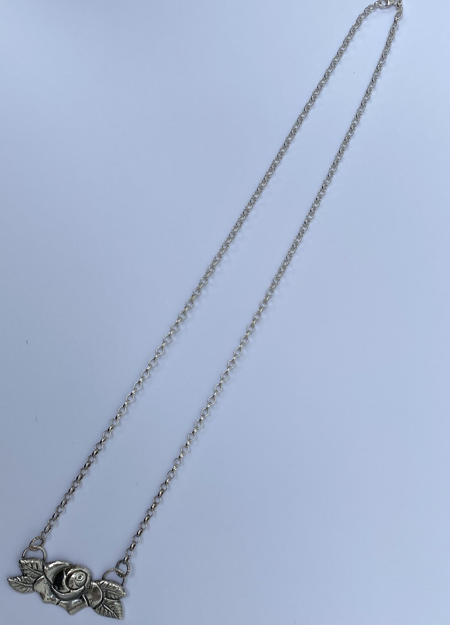 Solid Sterling Silver Rose Bib Necklace with Polished Rolo Chain; lobster clasp.